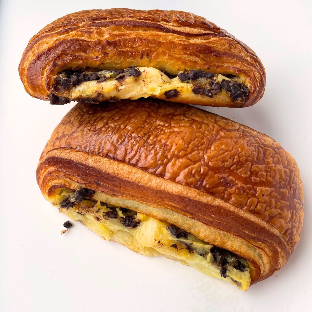 INGRÉDIENTS: Farine Blanche tout usage, beurre, sucre fin, lait écrémé en poudre, sel fin, levure fraîche, améliorant , Eau, crème pâtissière, pépite de chocolat. Toutes nos farine sont d'origine Canadienne ou Québécoise.